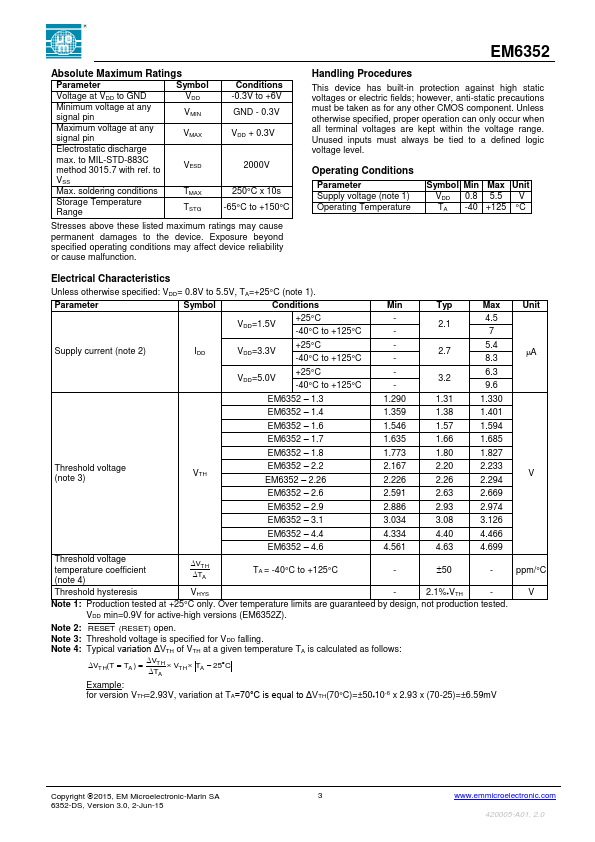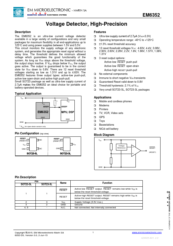 The EM6352 is an ultra-low current voltage detector available in a large variety of configurations and very small packages for maximum flexibility in all end-applications up to 125°C and using power supplies between 1.5V and 5.5V. This circuit monitors the supply voltage of any electronic system, and generates the appropriate reset signal without a delay time. The threshold defines the minimum allowed voltage which guarantees the good functionality of the system. As long as VDD stays above the threshold voltage, the output stays inactive. If VDD drops below VTH, the output goes active. The output is guaranteed to be in the correct state for VDD down to 0.8V.