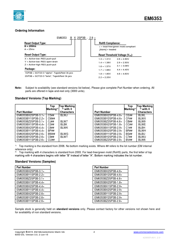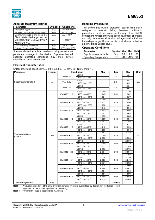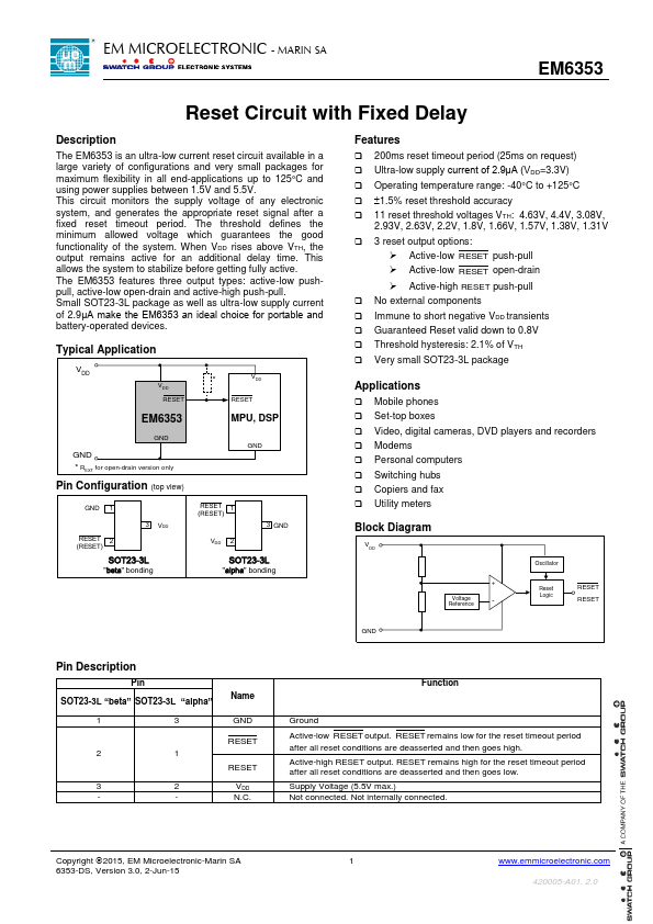 The EM6353 is an ultra-low current reset circuit available in a large variety of configurations and very small packages for maximum flexibility in all end-applications up to 125°C and using power supplies between 1.5V and 5.5V.