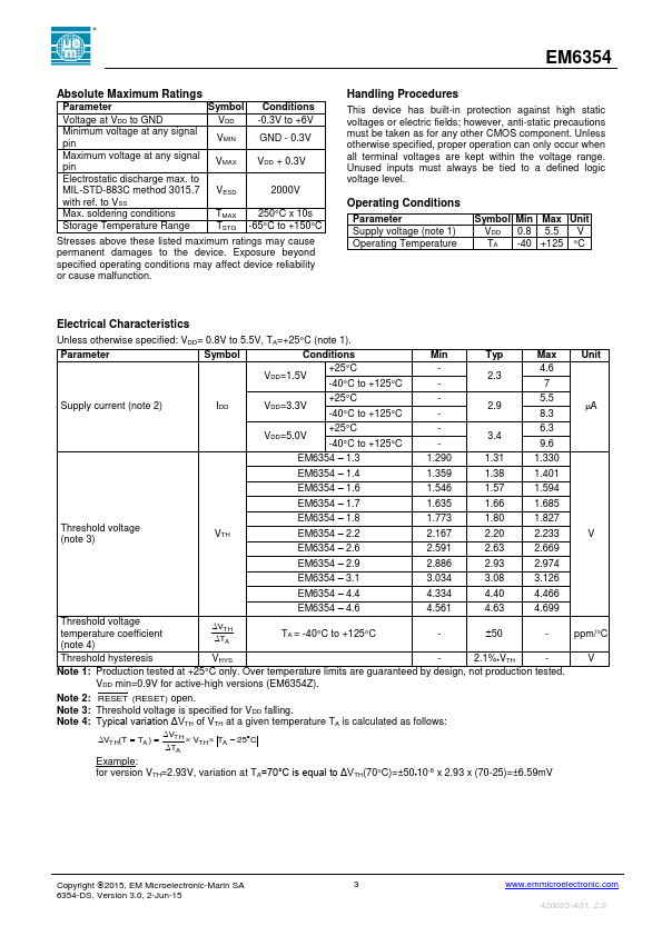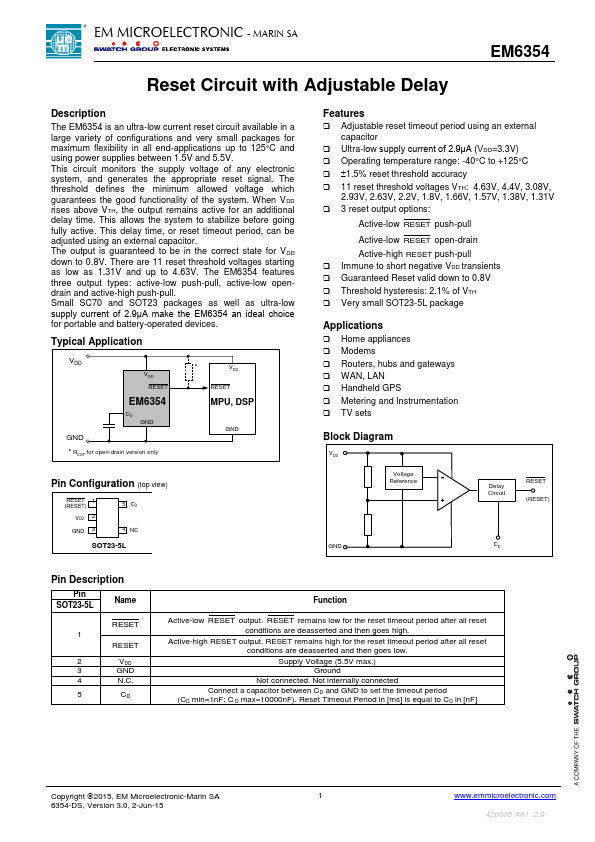 The EM6354 is an ultra-low current reset circuit available in a large variety of configurations and very small packages for maximum flexibility in all end-applications up to 125°C and using power supplies between 1.5V and 5.5V. This circuit monitors the supply voltage of any electronic system, and generates the appropriate reset signal. The threshold defines the minimum allowed voltage which guarantees the good functionality of the system. When VDD rises above VTH, the output remains active for an additional delay time. This allows the system to stabilize before going fully active. This delay time, or reset timeout period, can be adjusted using an external capacitor.
