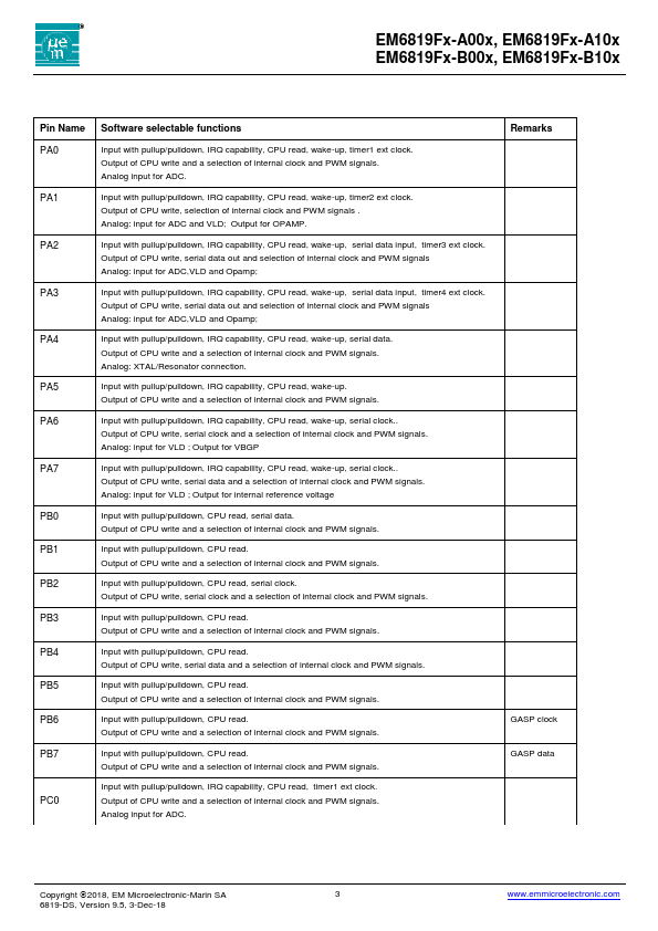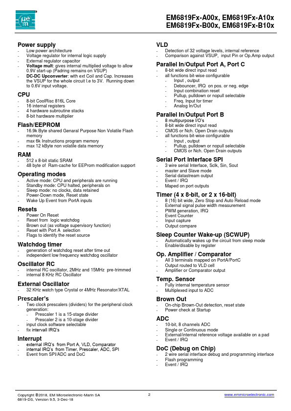 EM MICROELECTRONIC - MARIN SA EM6819Fx-A00x, EM6819Fx-A10x EM6819Fx-B00x, EM6819Fx-B10x Sub-1V (0.6V) 8bit Flash MCU DC-DC Converter, E2PROM Description The EM6819 is des...