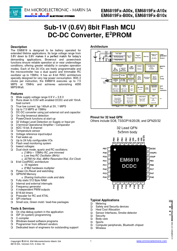 EM MICROELECTRONIC - MARIN SA EM6819Fx-A00x, EM6819Fx-A10x EM6819Fx-B00x, EM6819Fx-B10x Sub-1V (0.6V) 8bit Flash MCU DC-DC Converter, E2PROM Description The EM6819 is des...