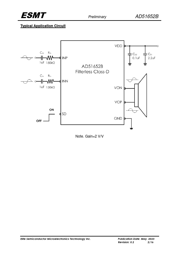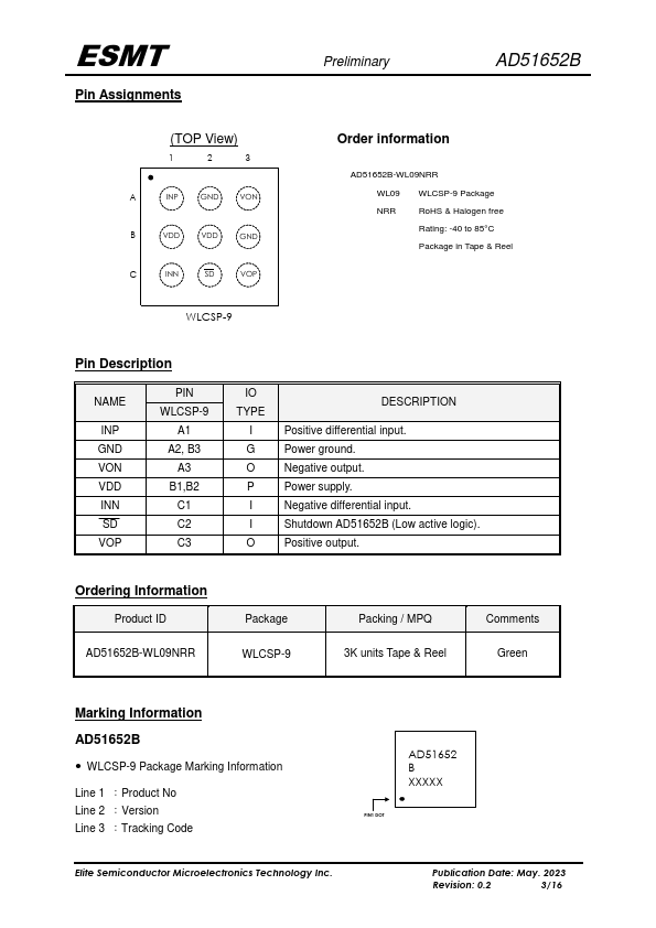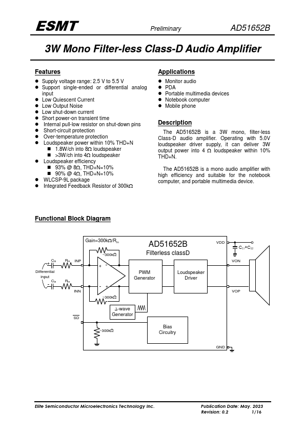 The AD51652B is a 3W mono, filter-less Class-D audio amplifier. Operating with 5.0V loudspeaker driver supply, it can deliver 3W output power into 4 loudspeaker within 10% THD+N. The AD51652B is a mono audio amplifier with high efficiency and suitable for the notebook puter, and portable multimedia device.