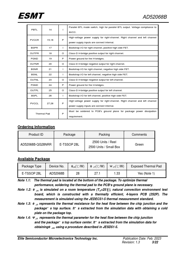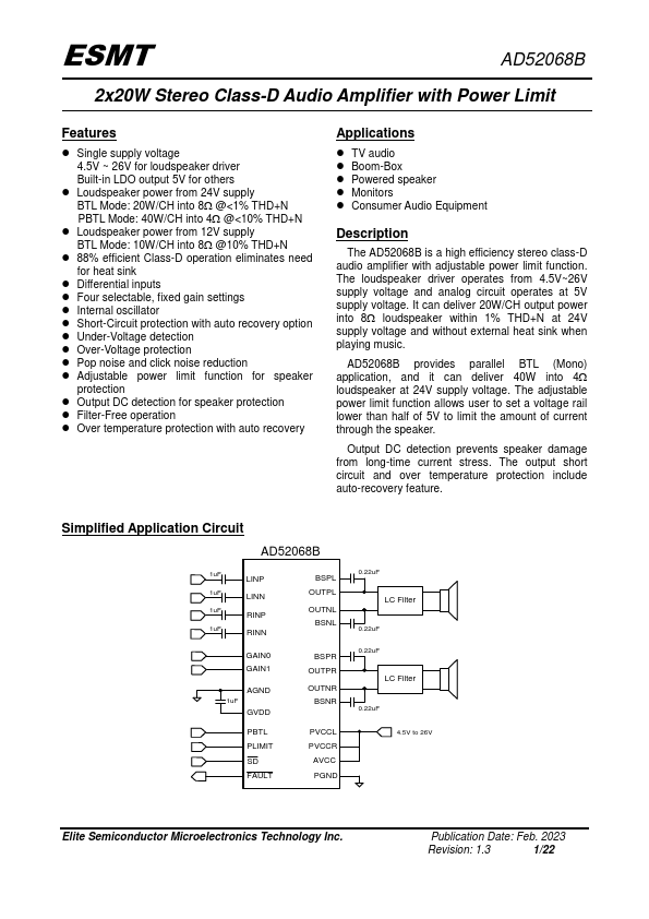 The AD52068B is a high efficiency stereo class-D audio amplifier with adjustable power limit function. The loudspeaker driver operates from 4.5V~26V supply voltage and analog circuit operates at 5V supply voltage. It can deliver 20W/CH output power into 8 loudspeaker within 1% THD+N at 24V supply voltage and without external heat sink when playing music.