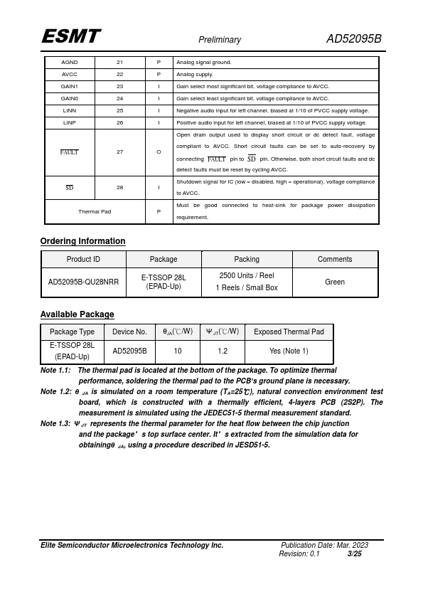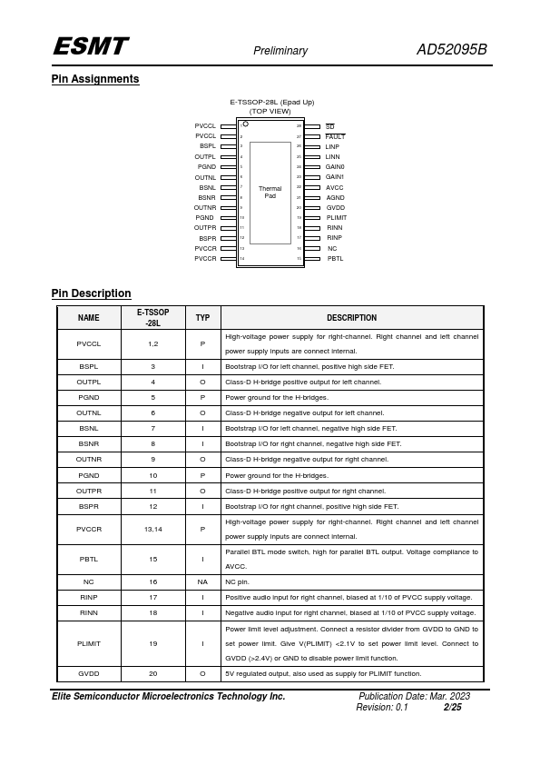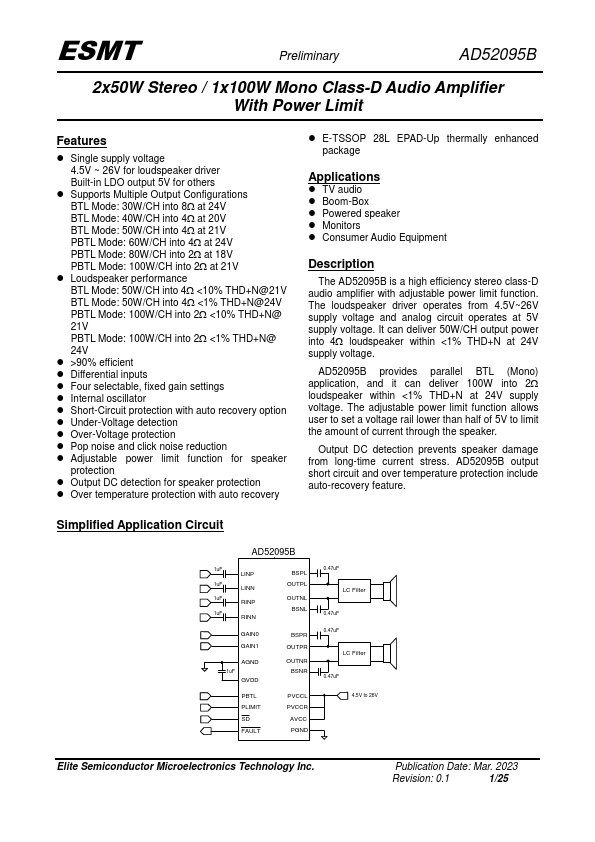 The AD52095B is a high efficiency stereo class-D audio amplifier with adjustable power limit function. The loudspeaker driver operates from 4.5V~26V supply voltage and analog circuit operates at 5V supply voltage. It can deliver 50W/CH output power into 4 loudspeaker within <1% THD+N at 24V supply voltage.