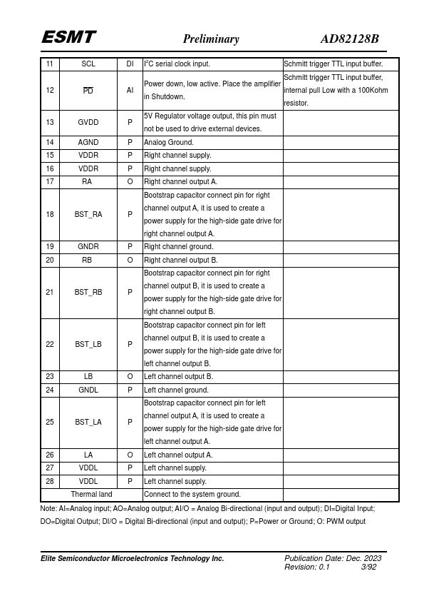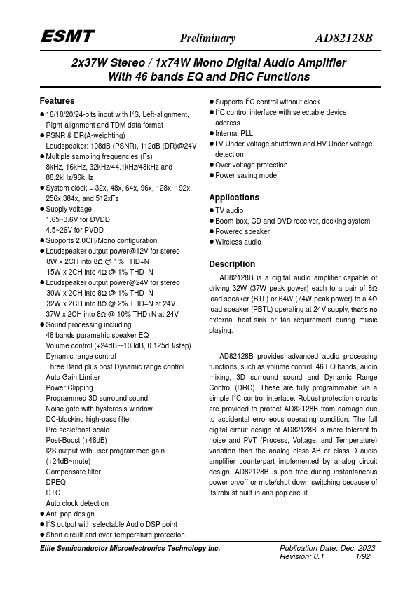 AD82128B is a digital audio amplifier capable of driving 32W (37W peak power) each to a pair of 8Ω load speaker (BTL) or 64W (74W peak power) to a 4Ω load speaker (PBTL) operating at 24V supply, that’s no external heat-sink or fan requirement during music playing. AD82128B provides advanced audio processing functions, such as volume control, 46 EQ bands, audio mixing, 3D surround sound and Dynamic Range Control...