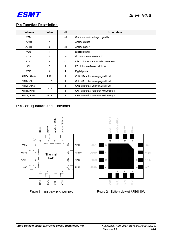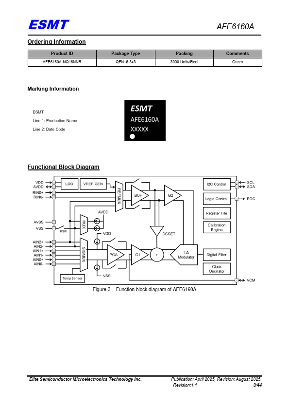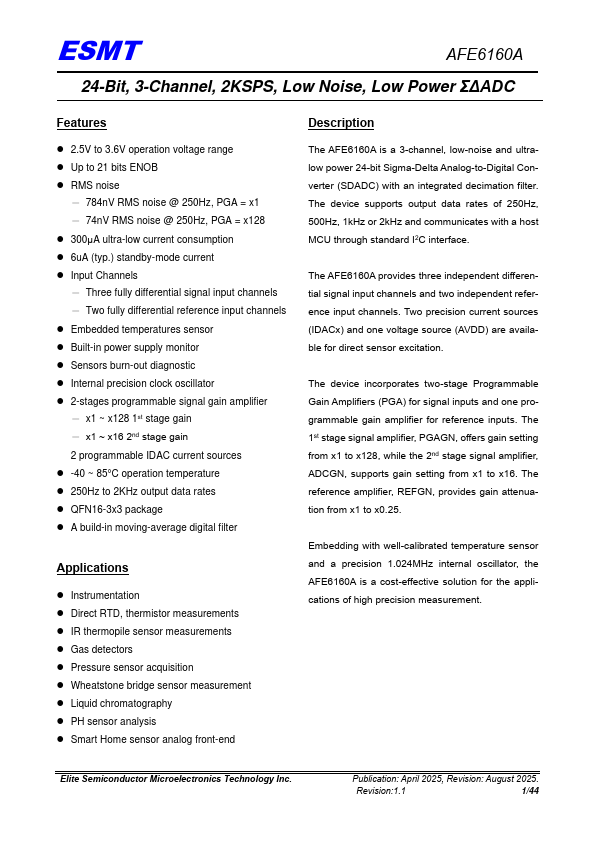 The AFE6160A is a 3-channel, low-noise and ultralow power 24-bit Sigma-Delta Analog-to-Digital Converter (SDADC) with an integrated decimation filter. The device supports output data rates of 250Hz, 500Hz, 1kHz or 2kHz and municates with a host MCU through standard I2C interface. The AFE6160A provides three independent differential signal input channels and two independent reference input channels.