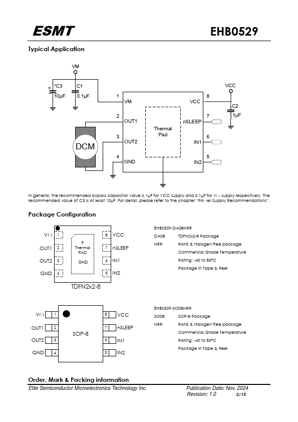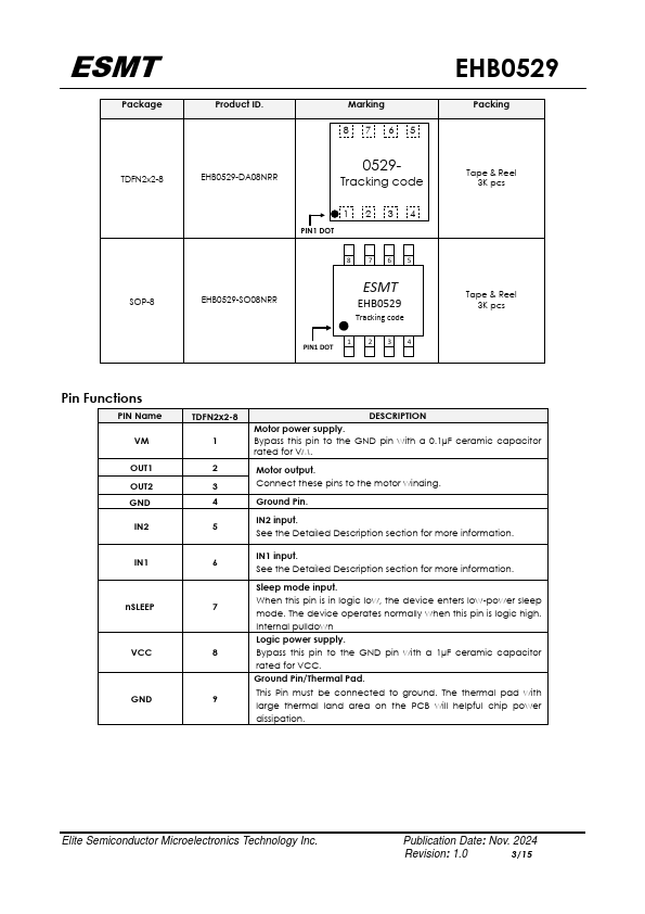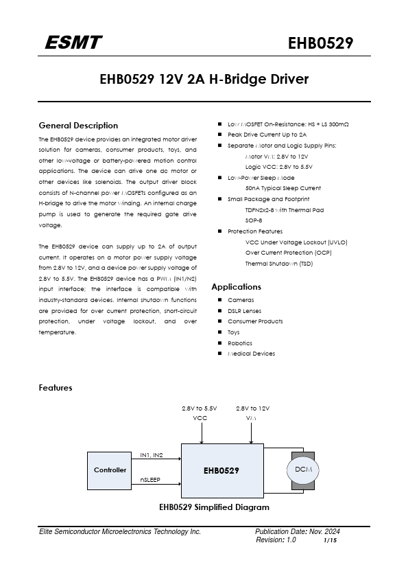 The EHB0529 device provides an integrated motor driver solution for cameras, consumer products, toys, and other low-voltage or battery-powered motion control applications. The device can drive one dc motor or other devices like solenoids. The output driver block consists of N-channel power MOSFETs configured as an H-bridge to drive the motor winding.
