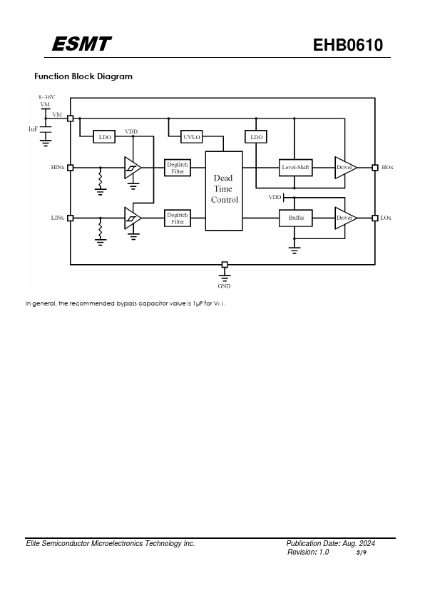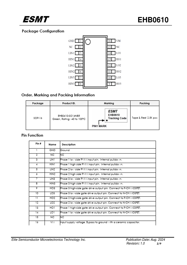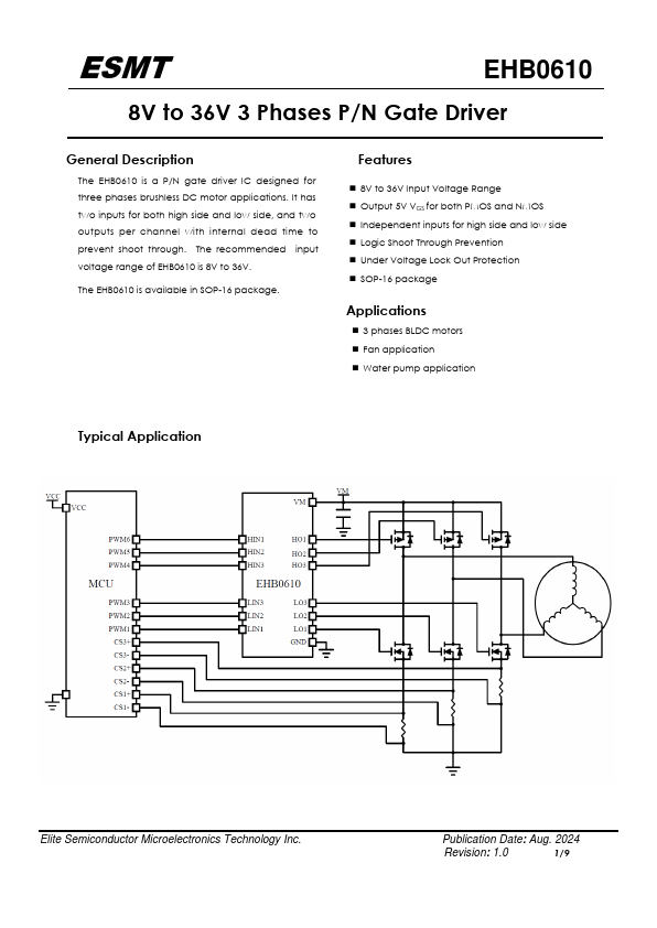 The EHB0610 is a P/N gate driver IC designed for three phases brushless DC motor applications. It has two inputs for both high side and low side, and two outputs per channel with internal dead time to prevent shoot through. The remended input voltage range of EHB0610 is 8V to 36V.