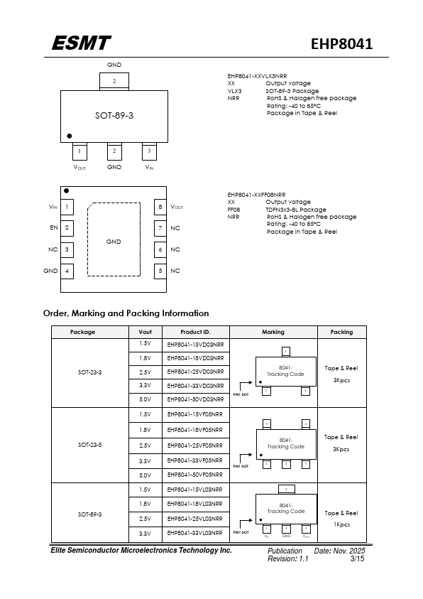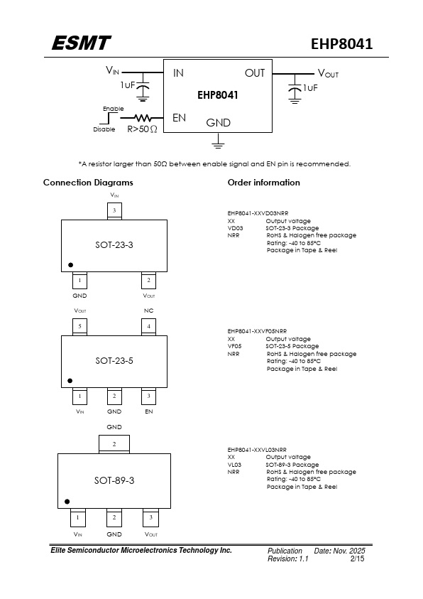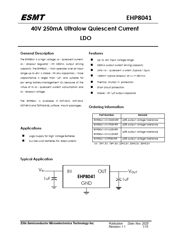 The EHP8041 is a high voltage, low quiescent current, low dropout regulator with 250mA output driving capacity. The EHP8041, which operates over an input range up to 40V, is stable with any capacitors, whose capacitance is larger than 1μF, and suitable for powering battery-management ICs because of the virtue of its low quiescent current consumption and low dropout voltage.