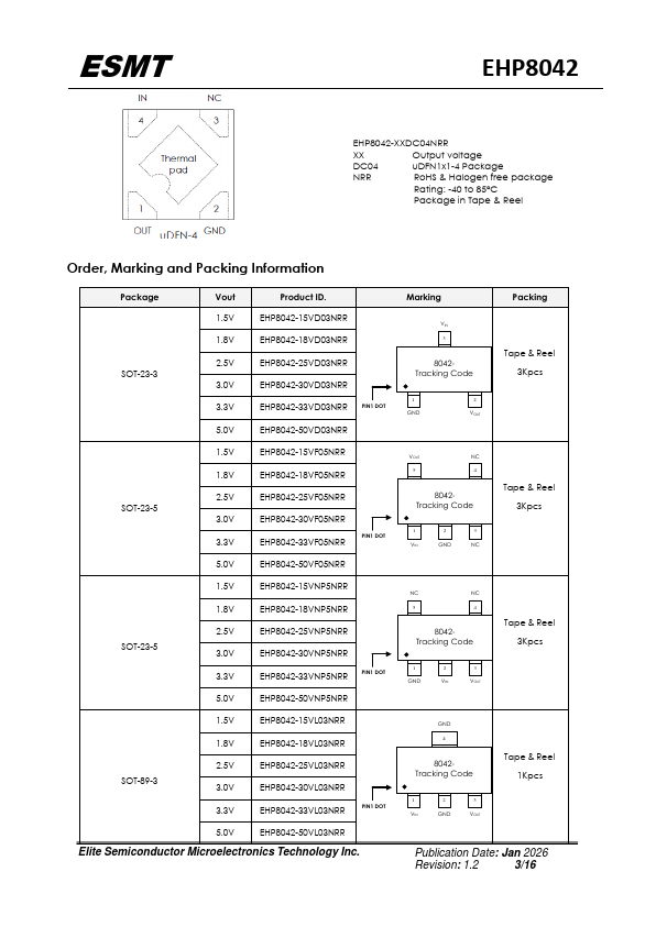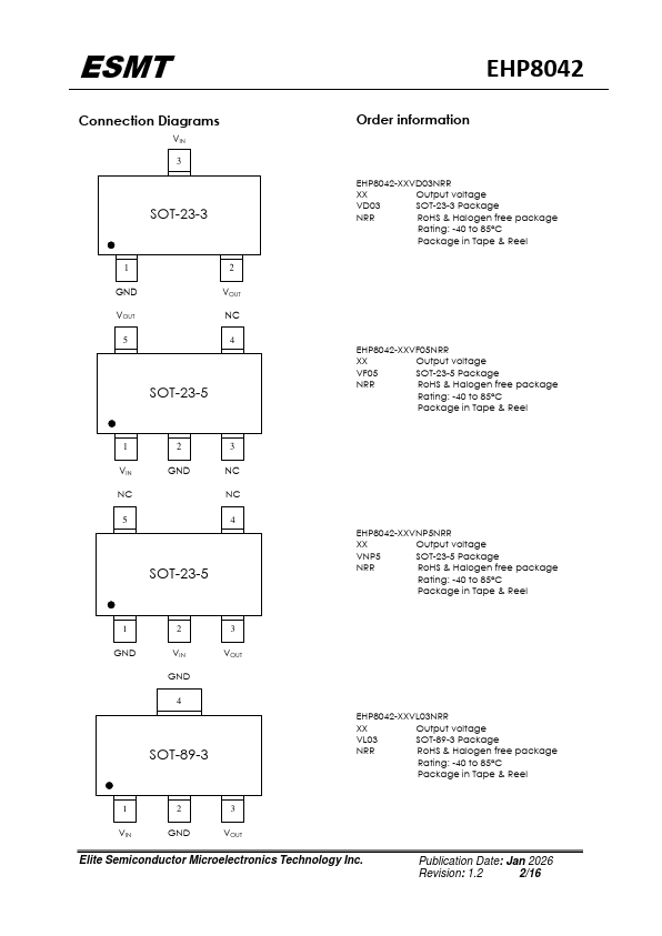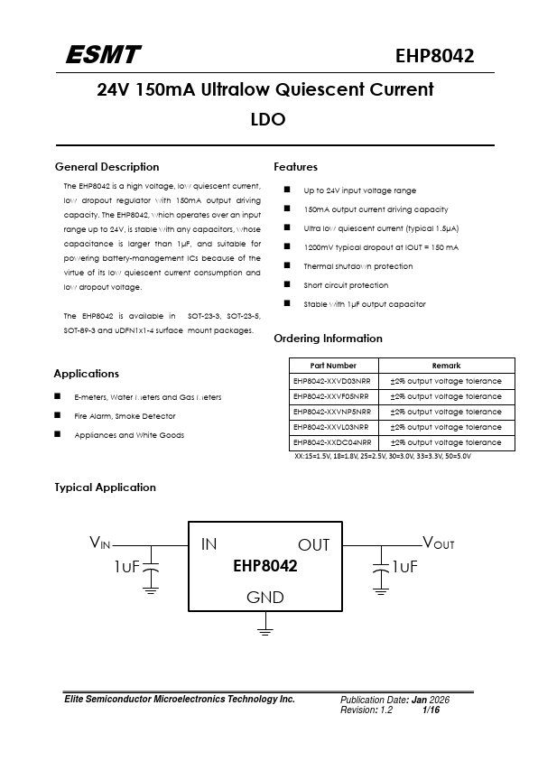 Features The EHP8042 is a high voltage, low quiescent current, low dropout regulator with 150mA output driving capacity. The EHP8042, which operates over an input range up to 24V, is stable with any capacitors, whose capacitance is larger than 1μF, and suitable for powering battery-management ICs because of the virtue of its low quiescent current consumption and low dropout voltage. The EHP8042 is available in...