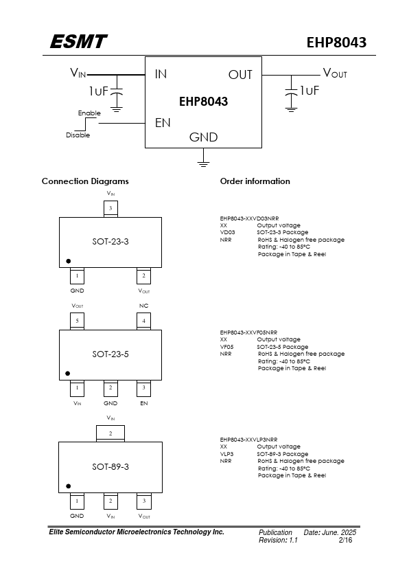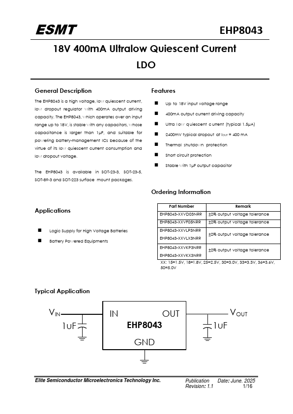 The EHP8043 is a high voltage, low quiescent current, low dropout regulator with 400mA output driving capacity. The EHP8043, which operates over an input range up to 18V, is stable with any capacitors, whose capacitance is larger than 1μF, and suitable for powering battery-management ICs because of the virtue of its low quiescent current consumption and low dropout voltage. The EHP8043 is available in SOT-23-3,...