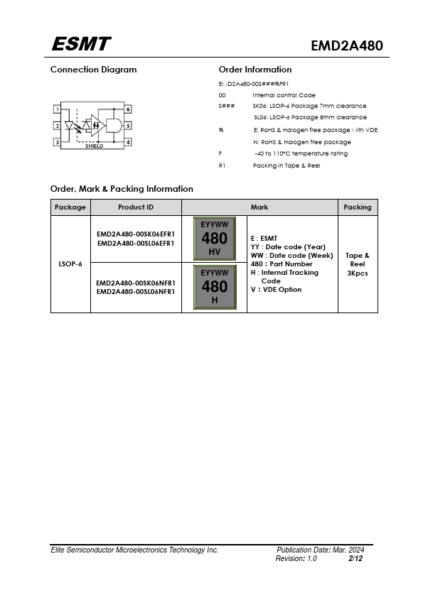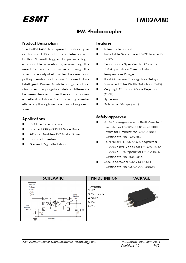 The EMD2A480 fast speed photocoupler contains a LED and photo detector with built-in Schmitt trigger to provide logic -patible waveforms, eliminating the need for additional wave shaping. The totem pole output eliminates the need for a pull up resistor and allows for direct drive Intelligent Power Module or gate drive. Minimized propagation delay difference between devices makes these optocouplers excellent...