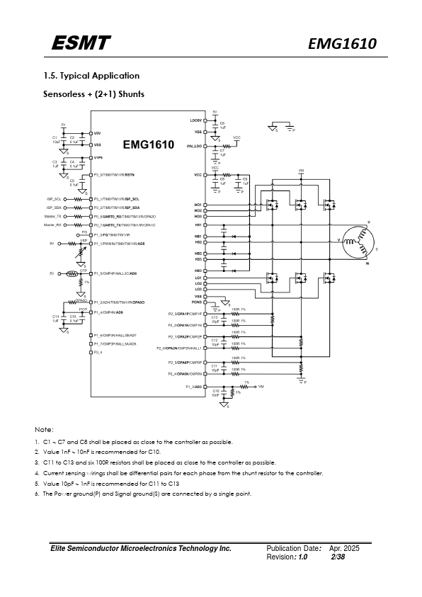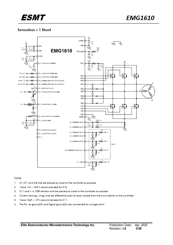 The EMG1610 includes a controller that integrates the 8051 core with peripheral circuits to perform Sine-Wave Field-oriented control (F.O.C.) of PMSM/BLDC motor applications. For rotor position detection, it support sensorless, Hall latch, Hall element, and BEMF input. In addition, system level peripheral functions, such as ADC, UART interface, IR decoder, watchdog timer, current sensing, short circuit protection...