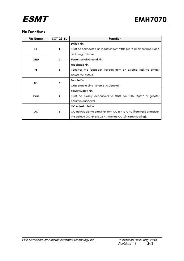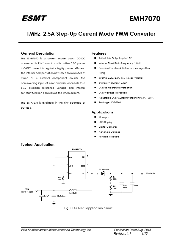The EMH7070 is a current mode boost DC-DC converter. Its PWM circuitry with built-in 0.2Ω power MOSFET make this regulator highly power efficient. The internal pensation network also minimizes as much as 6 external ponent counts.