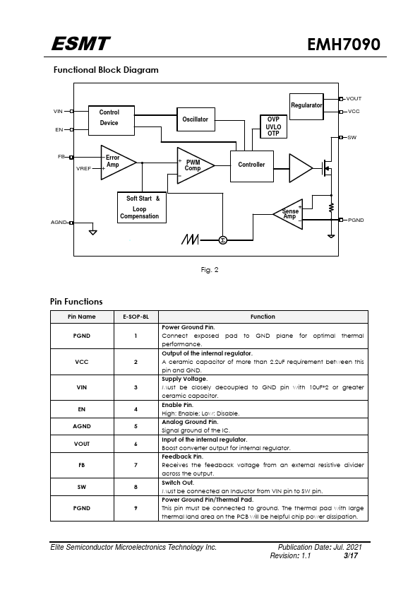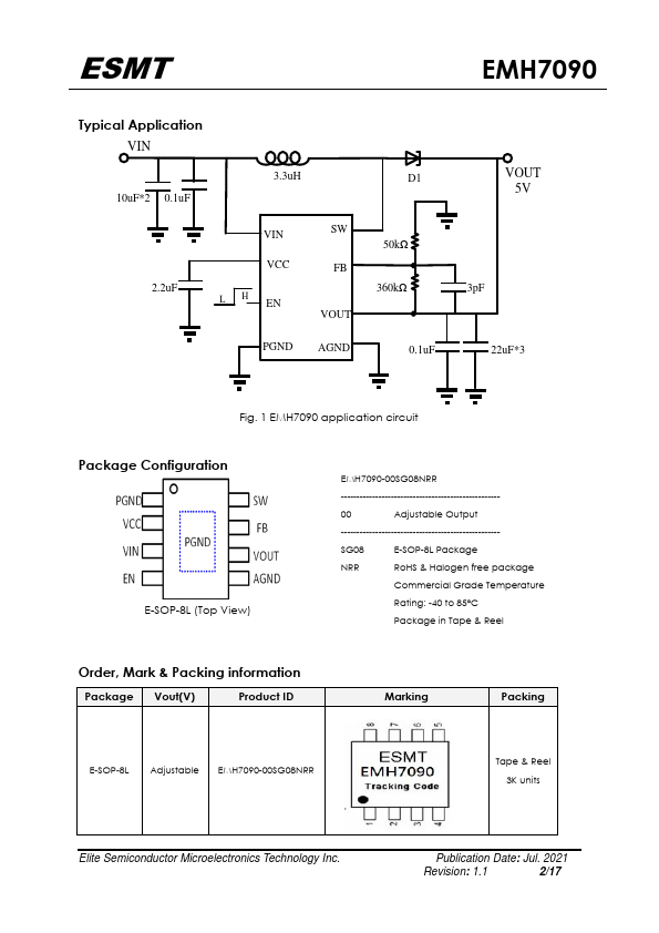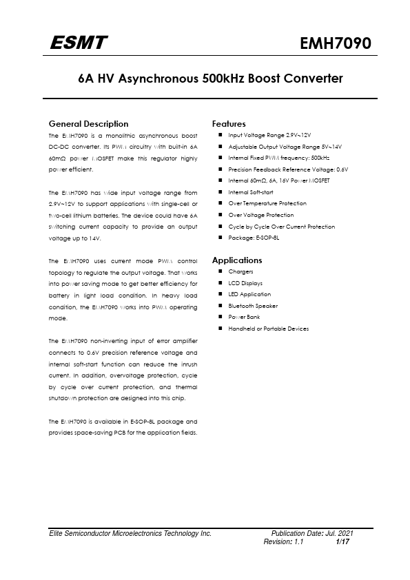 The EMH7090 is a monolithic asynchronous boost DC-DC converter. Its PWM circuitry with built-in 6A 60mΩ power MOSFET make this regulator highly power efficient. The EMH7090 has wide input voltage range from 2.9V~12V to support applications with single-cell or two-cell lithium batteries.