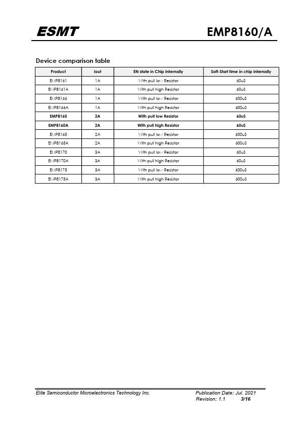 The EMP8160/A series can drive 2A of continuous output loading and provide a good performance with a typical dropout voltage as 185mV through an internal n-channel power MOSFETs. The output voltage can be adjustable from 0.8V to Vout that could be very close to VIN. The EMP8160/A series are available in E-SOP-8L package.