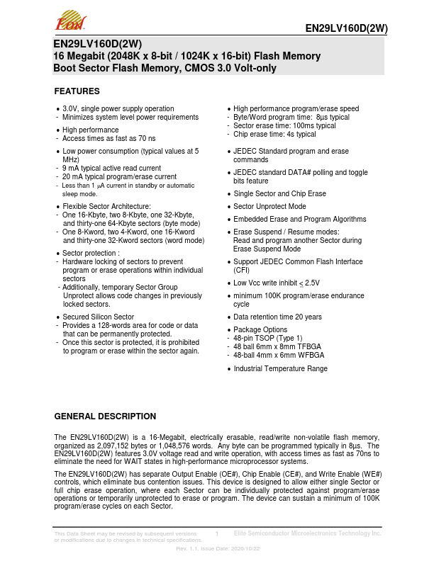 The EN29LV160D(2W) is a 16-Megabit, electrically erasable, read/write non-volatile flash memory, organized as 2,097,152 bytes or 1,048,576 words.