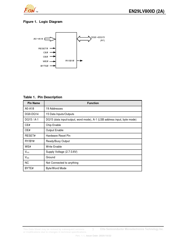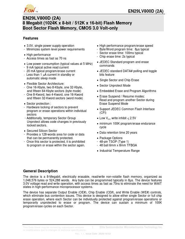 | EN29LV800C | 8 Megabit (1024K x 8-bit / 512K x 16-bit) Flash Memory | Eon Silicon Solution |