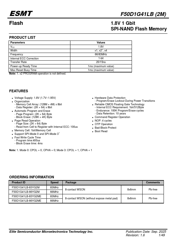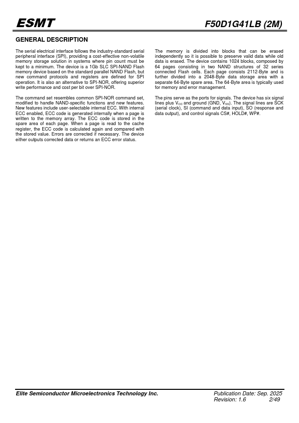 The serial electrical interface follows the industry-standard serial peripheral interface (SPI), providing a cost-effective non-volatile memory storage solution in systems where pin count must be kept to a minimum. The device is a 1Gb SLC SPI-NAND Flash memory device based on the standard parallel NAND Flash, but new mand protocols and registers are defined for SPI operation. It is also an alternative to SPI-NOR,...