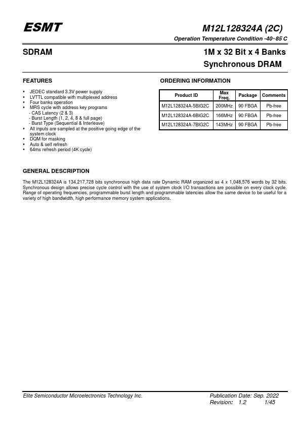 The M12L128324A is 134,217,728 bits synchronous high data rate Dynamic RAM organized as 4 x 1,048,576 words by 32 bits. Synchronous design allows precise cycle control with the use of system clock I/O transactions are possible on every clock cycle. Range of operating frequencies, programmable burst length and programmable latencies allow the same device to be useful for a variety of high bandwidth, high performance...