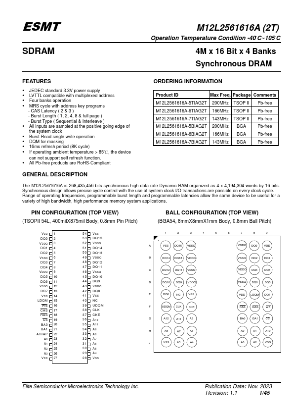 The M12L2561616A is 268,435,456 bits synchronous high data rate Dynamic RAM organized as 4 x 4,194,304 words by 16 bits. Synchronous design allows precise cycle control with the use of system clock I/O transactions are possible on every clock cycle. Range of operating frequencies, programmable burst length and programmable latencies allow the same device to be useful for a variety of high bandwidth, high performance...