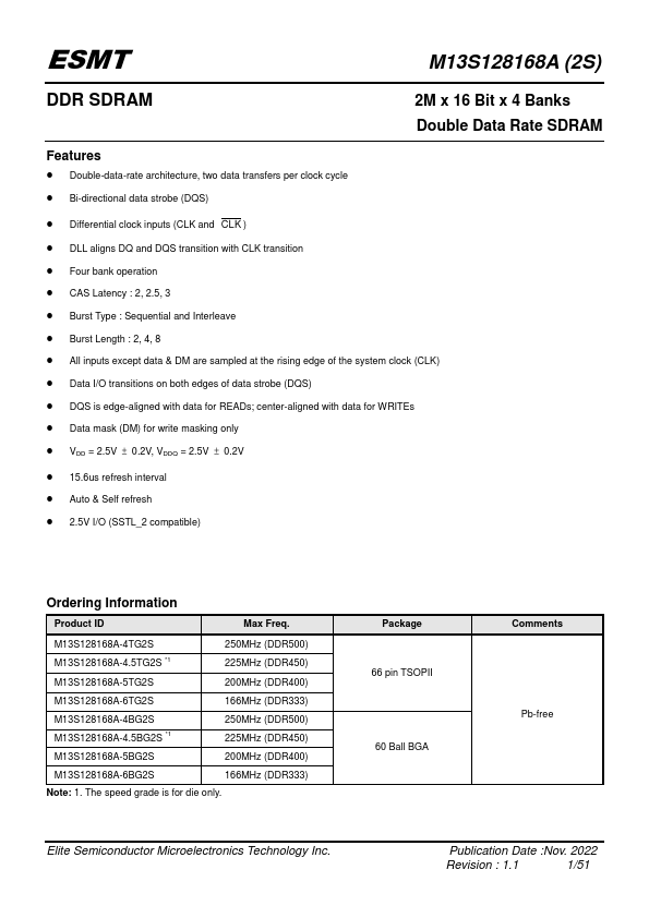 ESMT M13S128168A (2S) DDR SDRAM 2M x 16 Bit x 4 Banks Double Data Rate SDRAM Features  Double-data-rate architecture, two data transfers per clock cycle  Bi-directional data strobe (DQS)  Differential clock inputs (CLK and CLK )  DLL aligns DQ and DQS transition with CLK transition  Four bank operation  CAS Latency : 2, 2.5, 3  Burst Type : Sequential and Interleave  Burst Length : 2, 4, 8  All inputs except data & DM are sampled at the rising edge of the system clock (CLK)  Data I/O transitions on both edges of data strobe (DQS)  DQS is edge-aligned with data for READs; center-aligned with data for WRITEs  Data mask (DM) for write masking only  VDD = 2.5V ± 0.2V, VDDQ = 2.5V ± 0.2V  15.6us refresh interval  Auto & Self refresh  2.