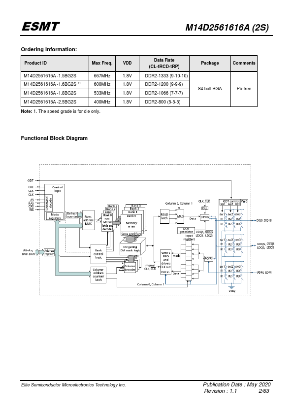 ESMT DDR II SDRAM M14D2561616A (2S) 4M x 16 Bit x 4 Banks DDR II.