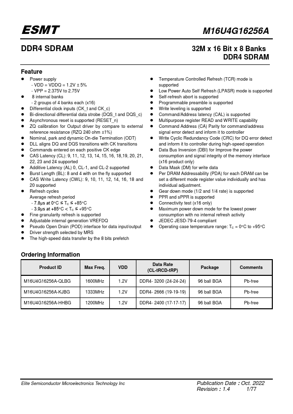 | M16U4G16256A-QLBG2Z | 256 Mb x 16 DDR4 SDRAM |