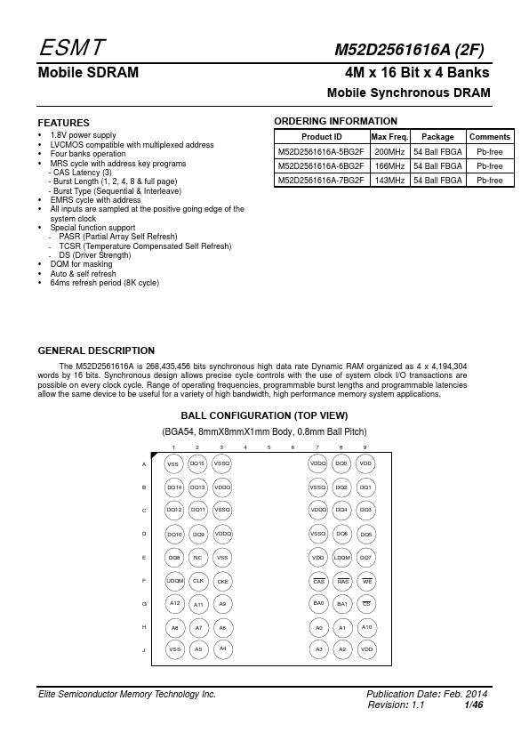 The M52D2561616A is 268,435,456 bits synchronous high data rate Dynamic RAM organized as 4 x 4,194,304 words by 16 bits.