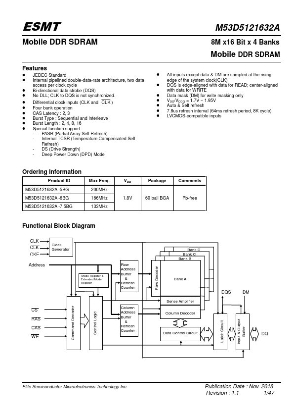 | M53D5123216A | 4M x 32Bit x 4 Banks Mobile DDR SDRAM |