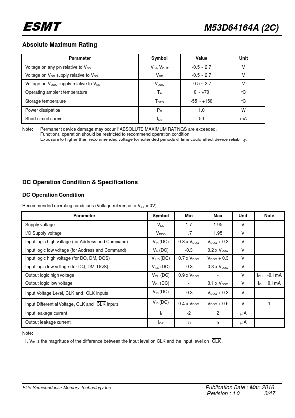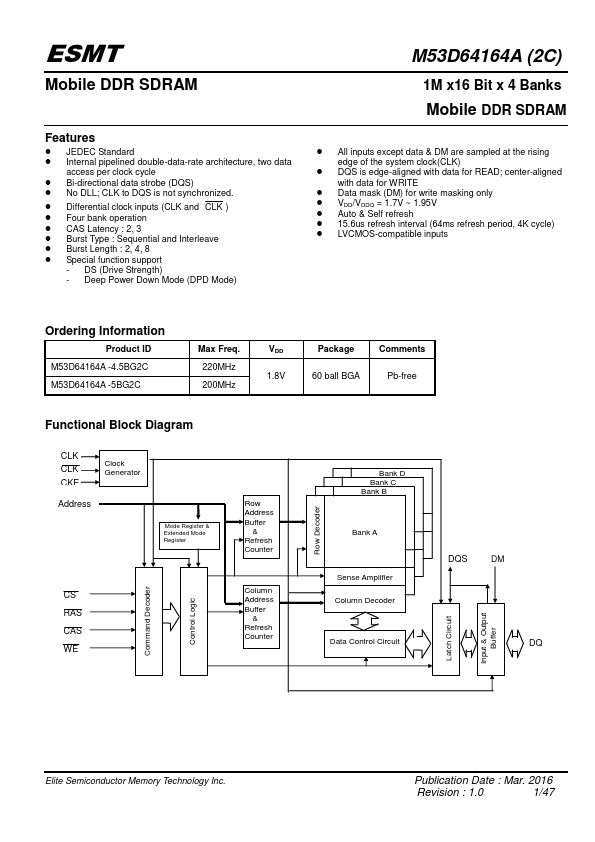 | M53D64164A | 1M x16 Bit x 4 Banks Mobile DDR SDRAM |