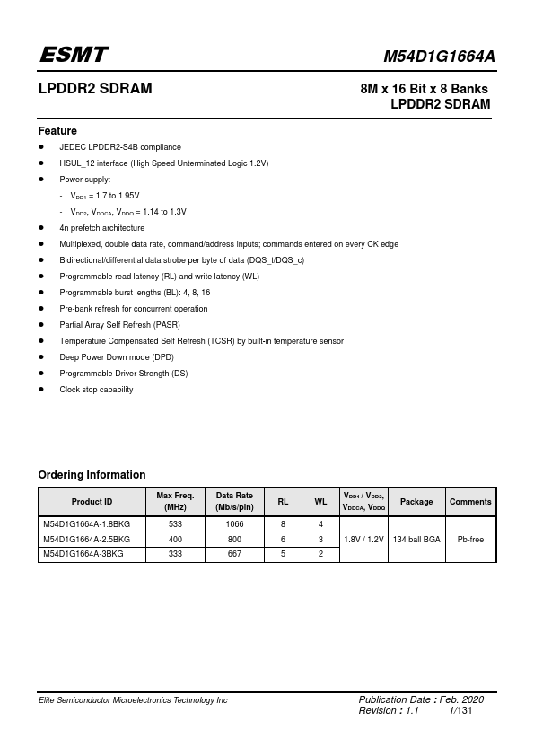 | M54D1G1664A-2.5BKG2G | 8M x 16 Bit x 8 Banks LPDDR2 SDRAM |