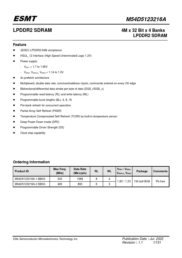 | M54D5121632A-2.5BKG | 8M x 16 Bit x 4 Banks LPDDR2 SDRAM |