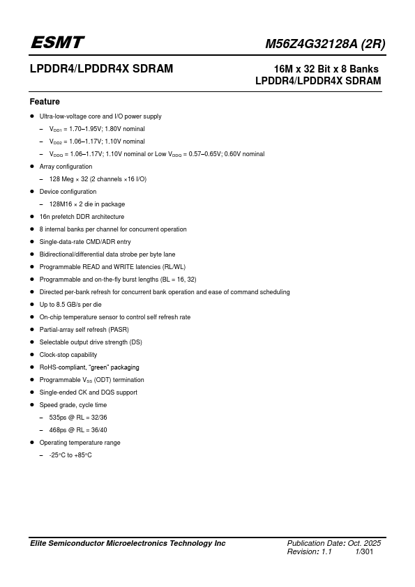 Ultra-low-voltage core and I/O power supply – VDD1 = 1.70–1.95V; 1.80V nominal – VDD2 = 1.06–1.17V; 1.10V nominal – VDDQ = 1.06–1.17V; 1.10V nominal or Low VDDQ = 0.57–0.65V; 0.60V nominal