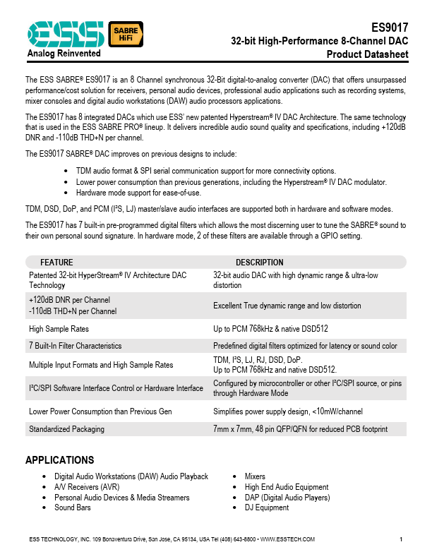 The ESS SABRE® ES9017 is an 8 Channel synchronous 32-Bit digital-to-analog converter (DAC) that offers unsurpassed performance/cost solution for receivers, personal audio devices, professional audio applications such as recording systems, mixer consoles and digital audio workstations (DAW) audio processors applications.
