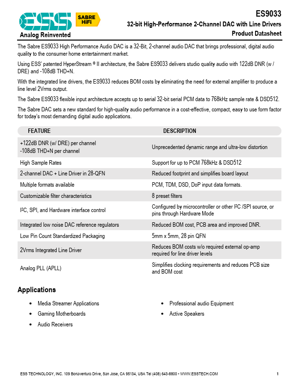 The Sabre ES9033 High Performance Audio DAC is a 32-Bit, 2-channel audio DAC that brings professional, digital audio quality to the consumer home entertainment market.