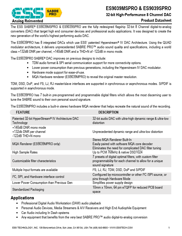 | ES9039PRO | 32-bit High-Performance 8-Channel DAC |