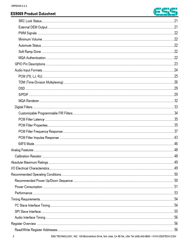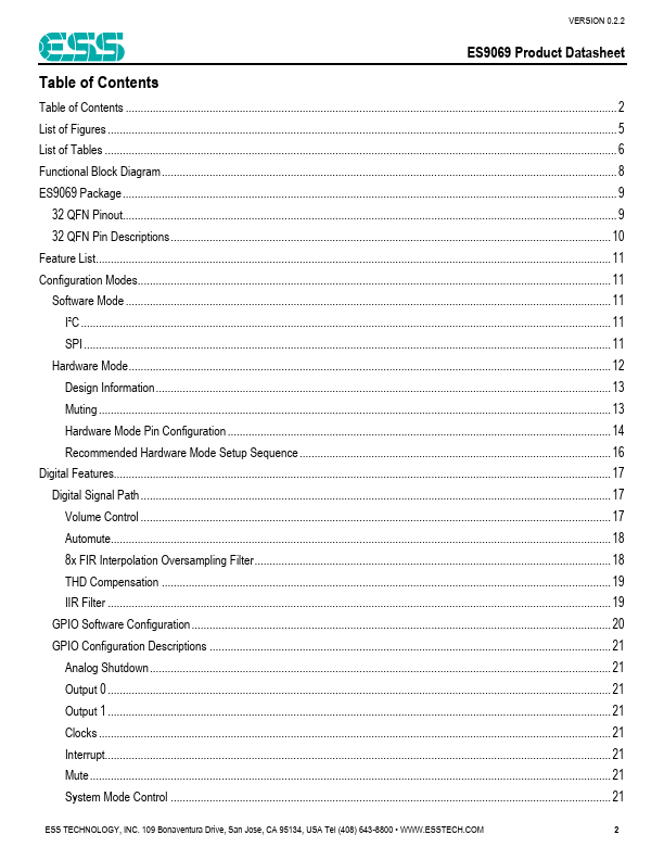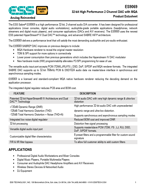 The ESS Sabre® ES9069 is a high performance 32-bit, 2-channel audio D/A converter. It has been designed for professional applications (mixer consoles, digital audio workstations), audiophile-grade portable applications (headphones, network streamers and digital music players), and consumer applications (DACs and A/V receivers). The ES9069 uses the newest ESS patented HyperStream® IV Dual DAC™ technology, and advanced SABRE HiFi® architecture.