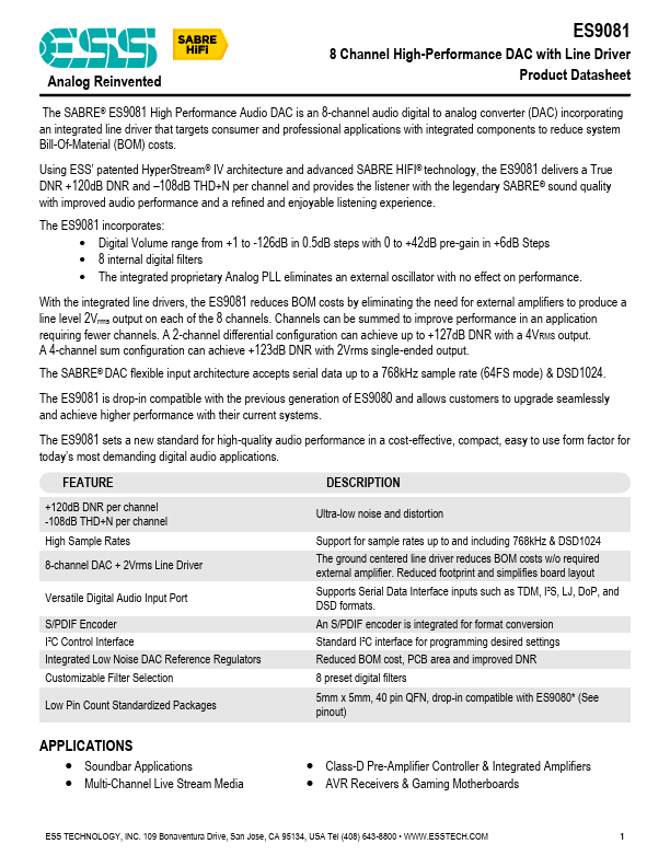 | ES9080 | 32-bit High-Performance 8-Channel DAC |