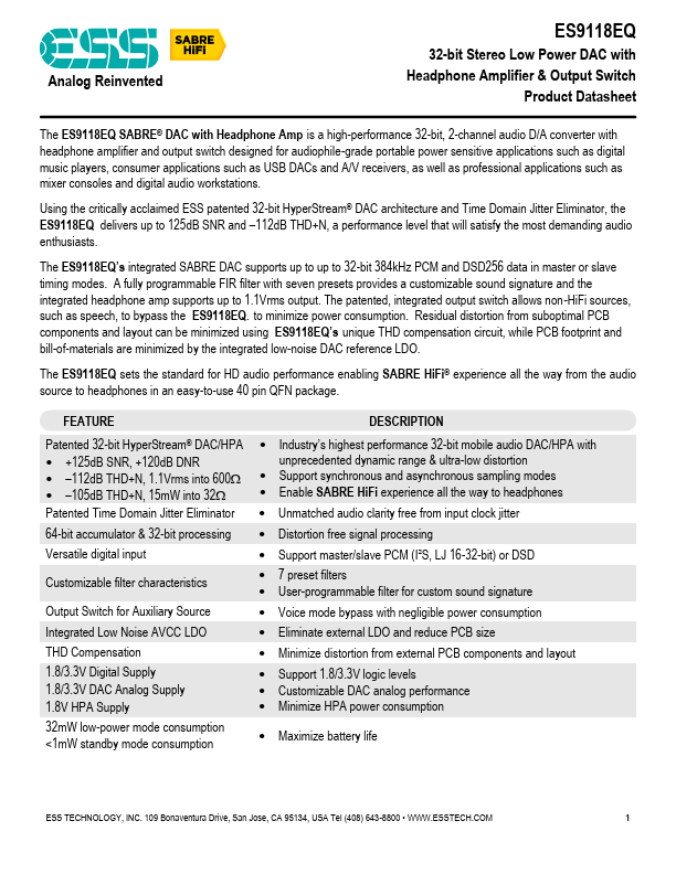 The ES9118EQ SABRE® DAC with Headphone Amp is a high-performance 32-bit, 2-channel audio D/A converter with headphone amplifier and output switch designed for audiophile-grade portable power sensitive applications such as digital music players, consumer applications such as USB DACs and A/V receivers, as well as professional applications such as mixer consoles and digital audio workstations.