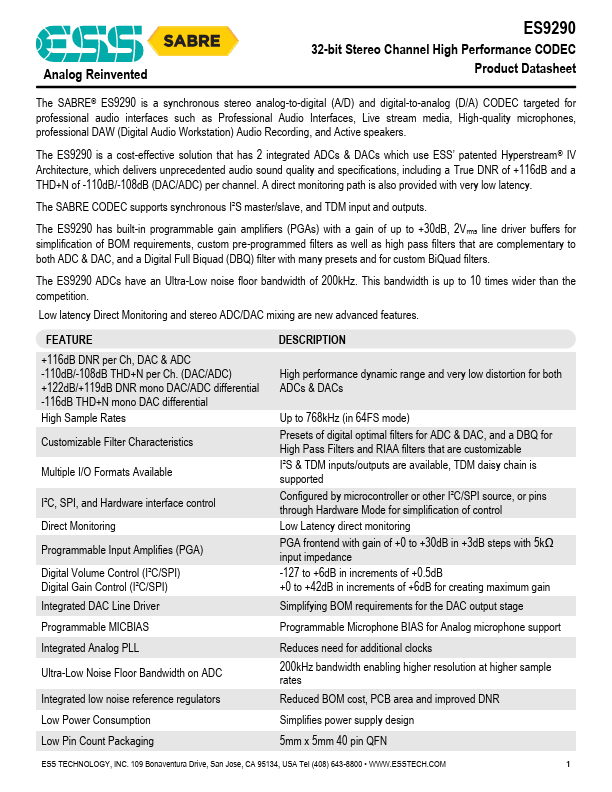 The SABRE® ES9290 is a synchronous stereo analog-to-digital (A/D) and digital-to-analog (D/A) CODEC targeted for professional audio interfaces such as Professional Audio Interfaces, Live stream media, High-quality microphones, professional DAW (Digital Audio Workstation) Audio Recording, and Active speakers.