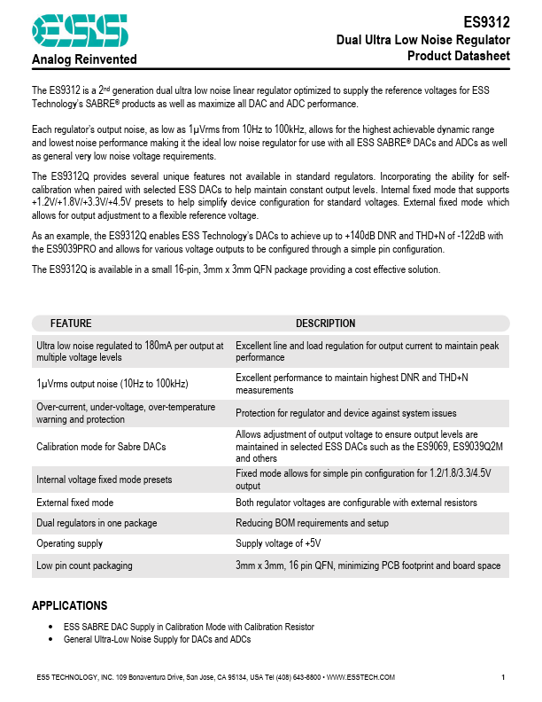 | ES9311Q | Ultra-Low Noise Linear Regulator |