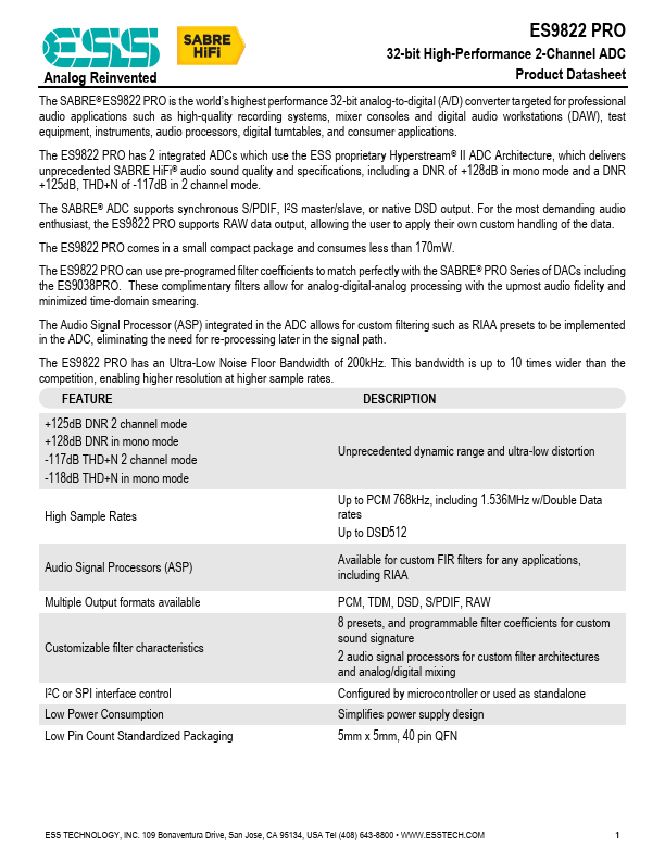 Analog Reinvented ES9822 PRO 32-bit High-Performance 2-Channel ADC Product Datasheet The SABRE® ES9822 PRO is the world’s highest performance 32-bit analog-to-digital (A/D) converter targeted for professional audio applications such as high-quality recording systems, mixer consoles and digital audio workstations (DAW), test equipment, instruments, audio processors, digital turntables, and consumer applications.
