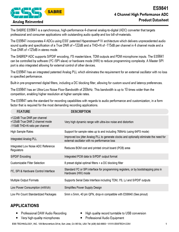 The SABRE ES9841 is a synchronous, high-performance 4-channel analog-to-digital (ADC) converter that targets professional and consumer applications with outstanding audio quality and low bill-of-materials.