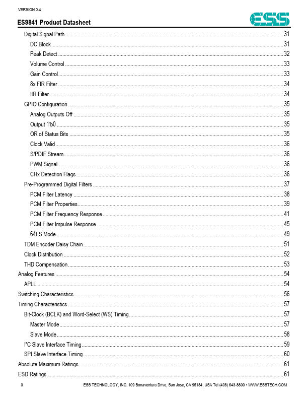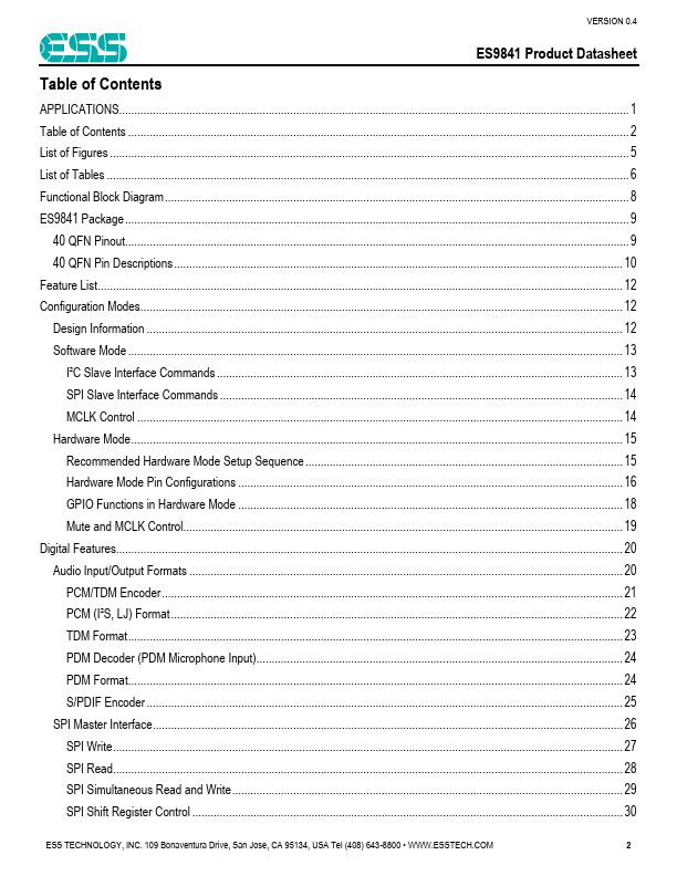 The SABRE® ADC supports S/PDIF encoding, I²S master/slave, TDM outputs and PDM microphone inputs. The ES9841 can be controlled by software (I²C /SPI slave) or hardware mode (HW) to reduce programming complexity.