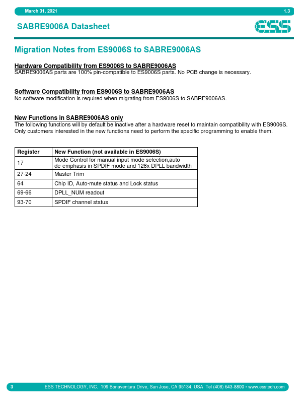The SABRE9006A is a pincompatible replacement for the ES9006 and offers significantly improved linearity versus the ES9006.