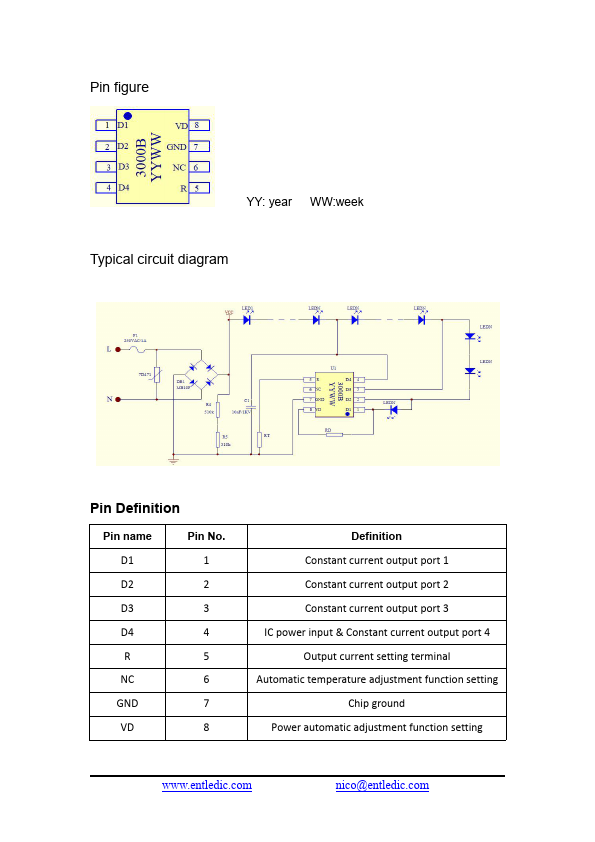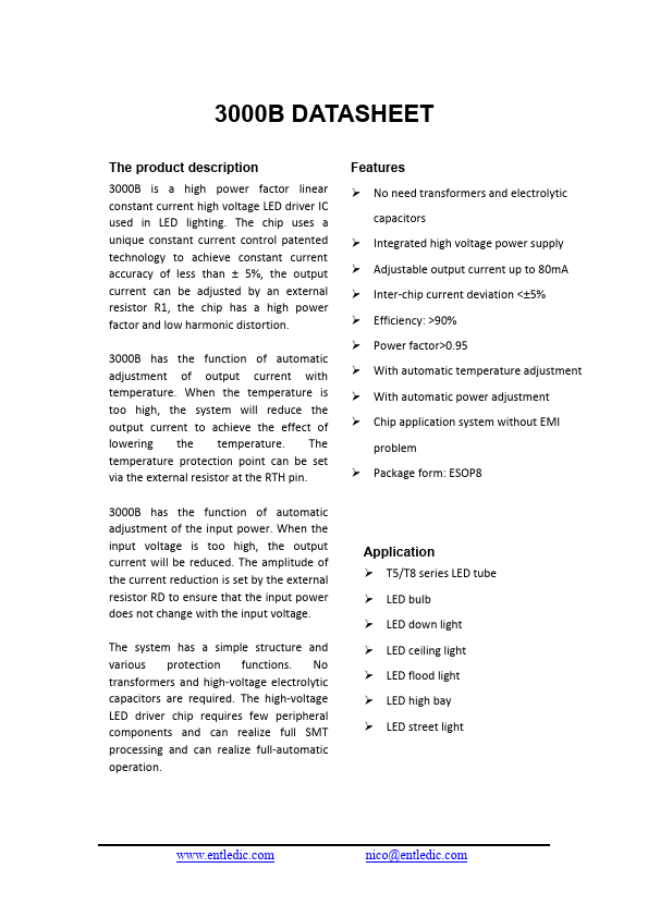 3000B is a high power factor linear constant current high voltage LED driver IC used in LED lighting. The chip uses a unique constant current control patented technology to achieve constant current accuracy of less than ± 5%, the output current can be adjusted by an external resistor R1, the chip has a high power factor and low harmonic distortion. 3000B has the function of automatic adjustment of output current...
