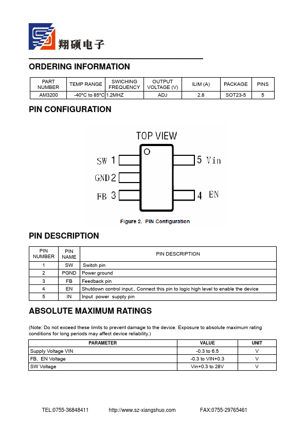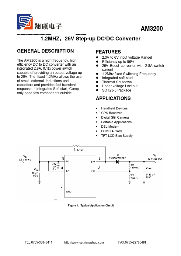The AM3200 is a high frequency, high efficiency DC to DC converter with an integrated 2.8A, 0.1Ω power switch capable of providing an output voltage up to 26V. The fixed 1.2MHz allows the use of small external inductions and capacitors and provides fast transient response. It integrates Soft start, p,.