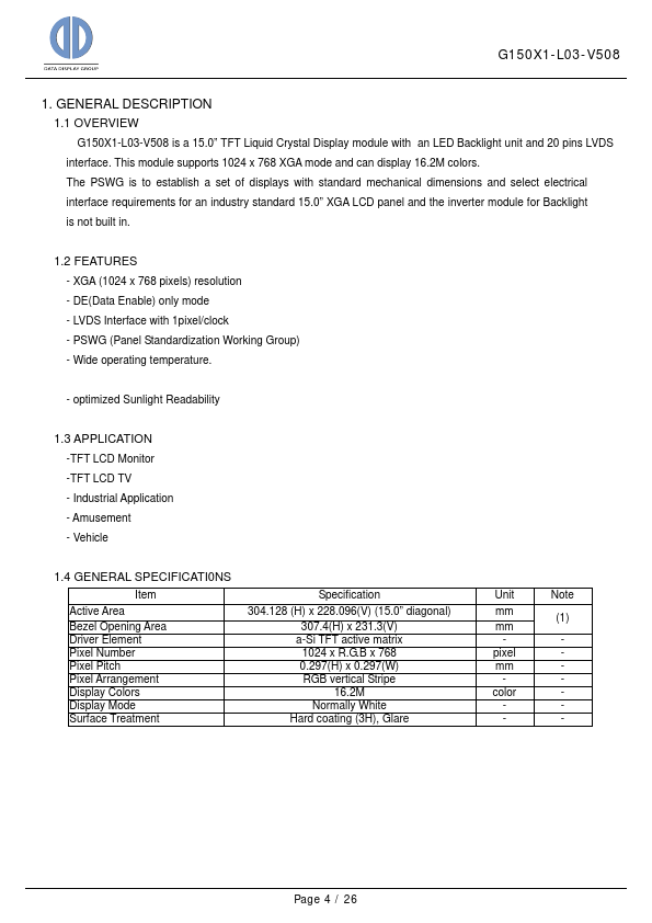 1.1 OVERVIEW G150X1-L03-V508 is a 15.0” TFT Liquid Crystal Display module with an LED Backlight unit and 20 pins LVDS interface. This module supports 1024 x 768 XGA mode and can display 16.2M colors. The PSWG is to establish a set of displays with standard mechanical dimensions and select electrical interface requirements for an industry standard 15.0” XGA LCD panel and the inverter module for Backlight is not built...