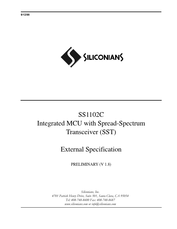 Description The SS1102C is a CMOS integrated solution for direct sequence spread spectrum digital wireless data communication applications. The chip performs all CPU, baseband modem and peripheral control functions.